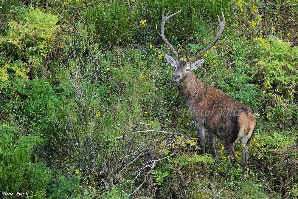 Macho de ciervo (Cervus elaphus) campeando en una zona de matorral pocas semanas antes de la berrea.